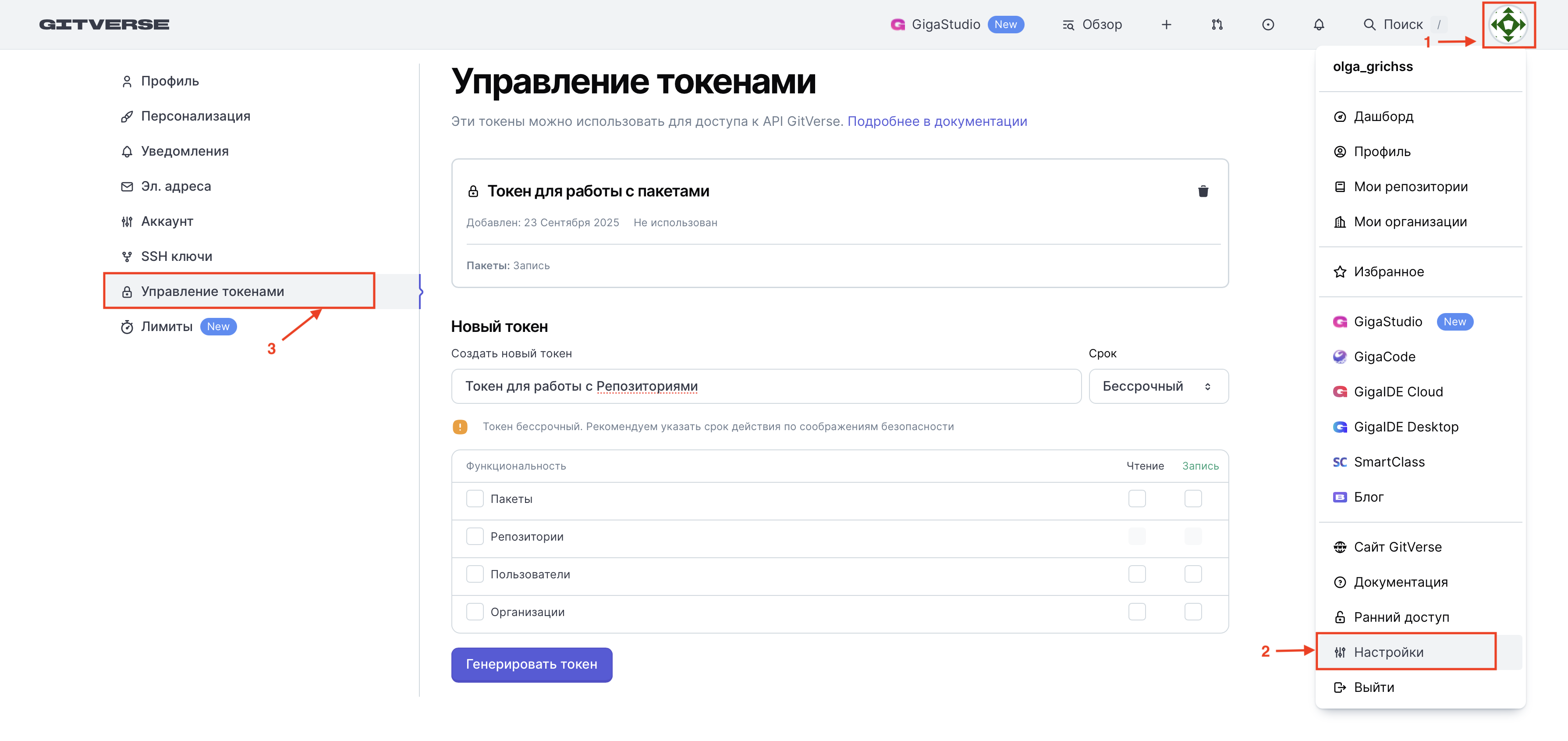 Введите имя токена, определите доступ к функциональности и нажмите Генерировать токен: