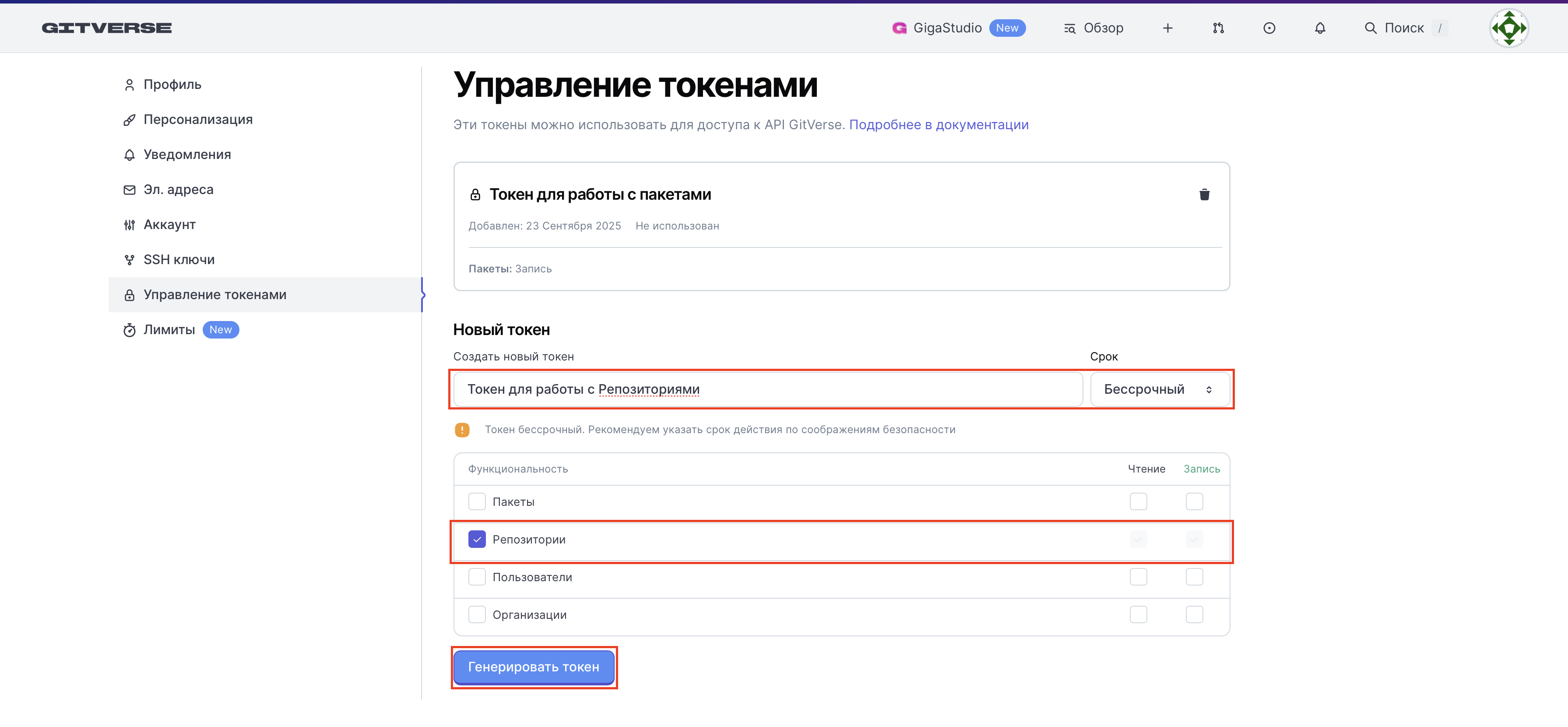 Введите название токена и отметьте чекбокс Репозитории, нажмите Генерировать токен: