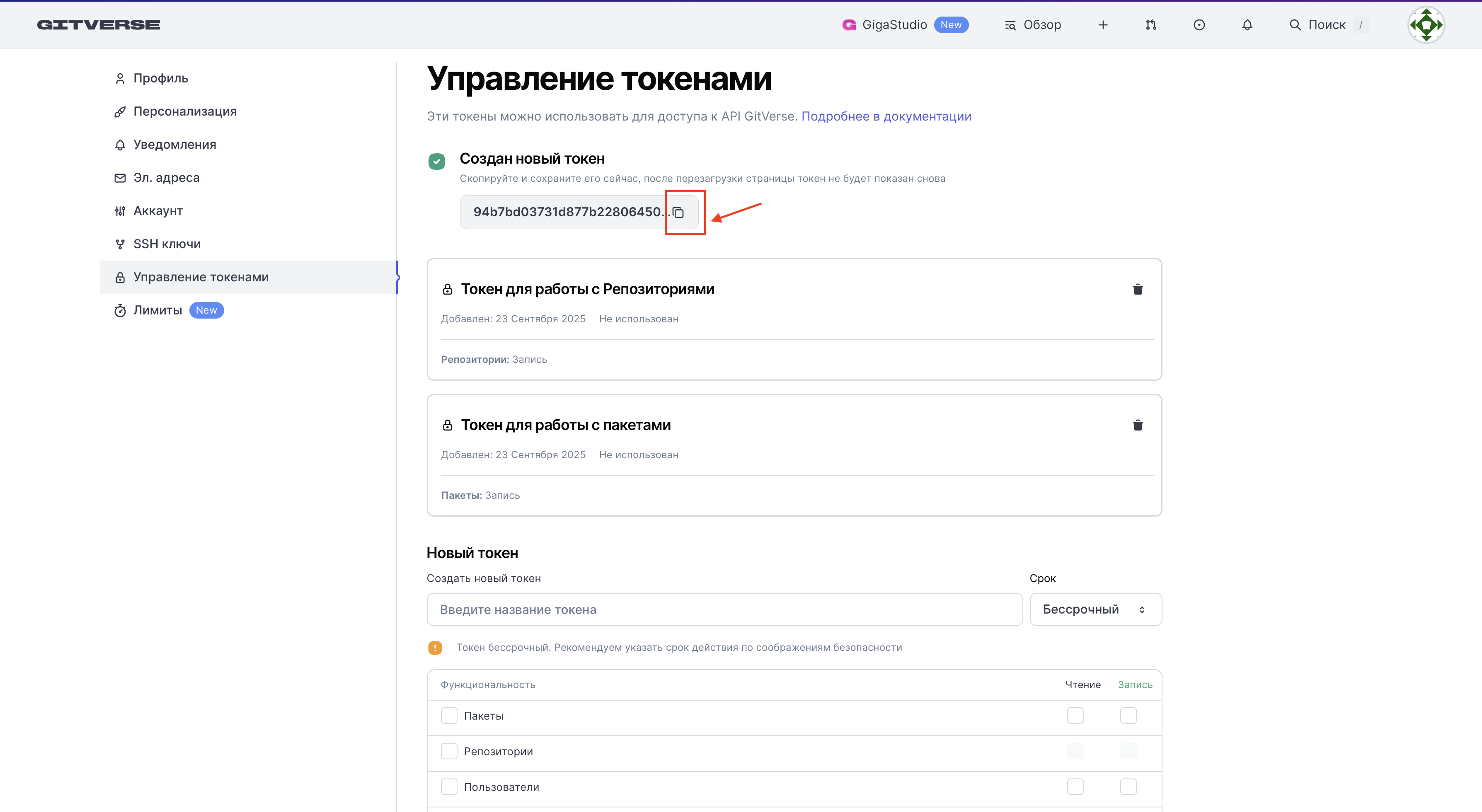 ⚠️Скопируйте и сохраните токен до перезагрузки страницы, т.к. после он не отобразится.