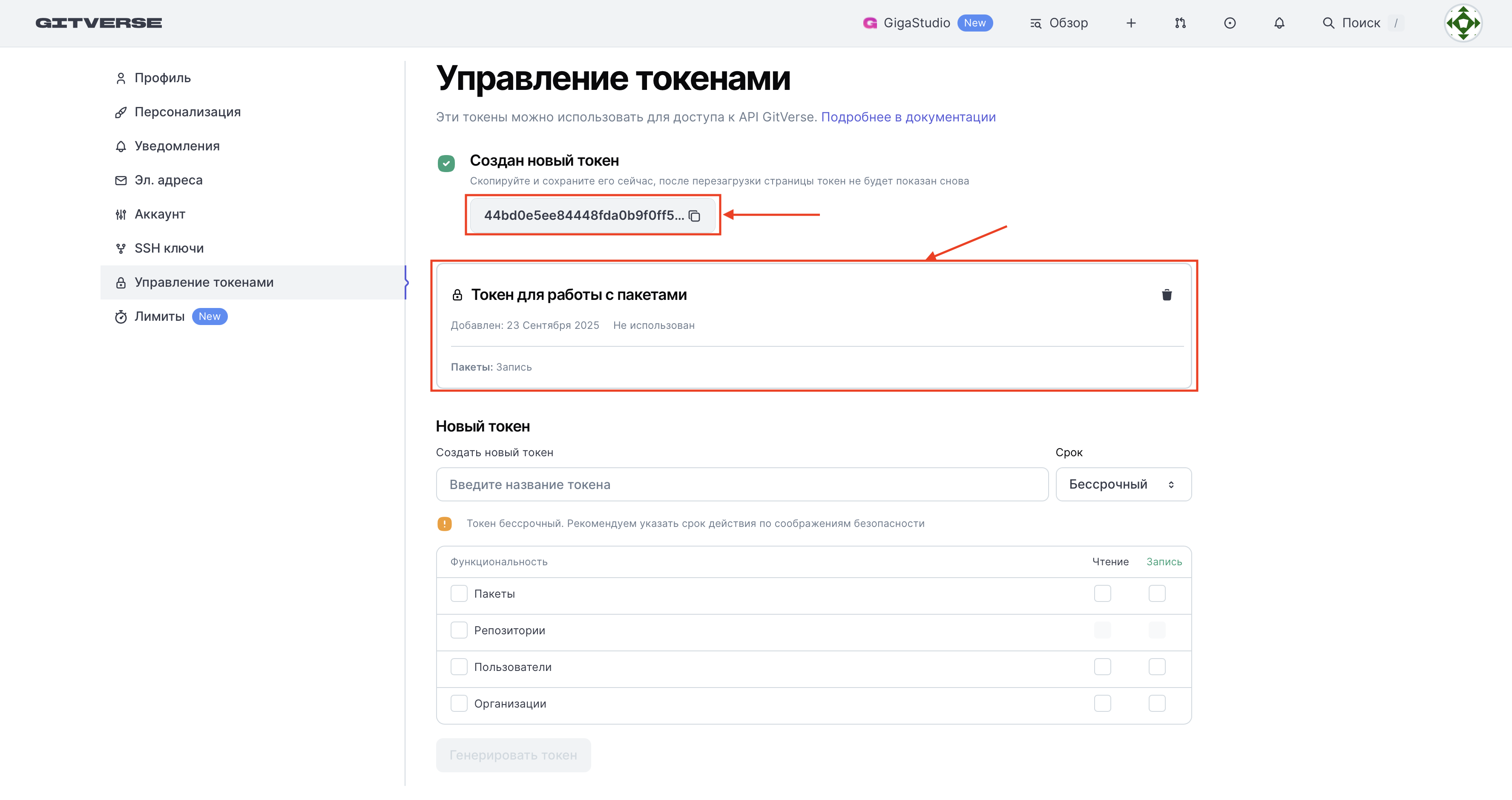 ⚠️После загрузки токен больше не отобразится, поэтому скопируйте и сохраните токен до перезагрузки страницы.