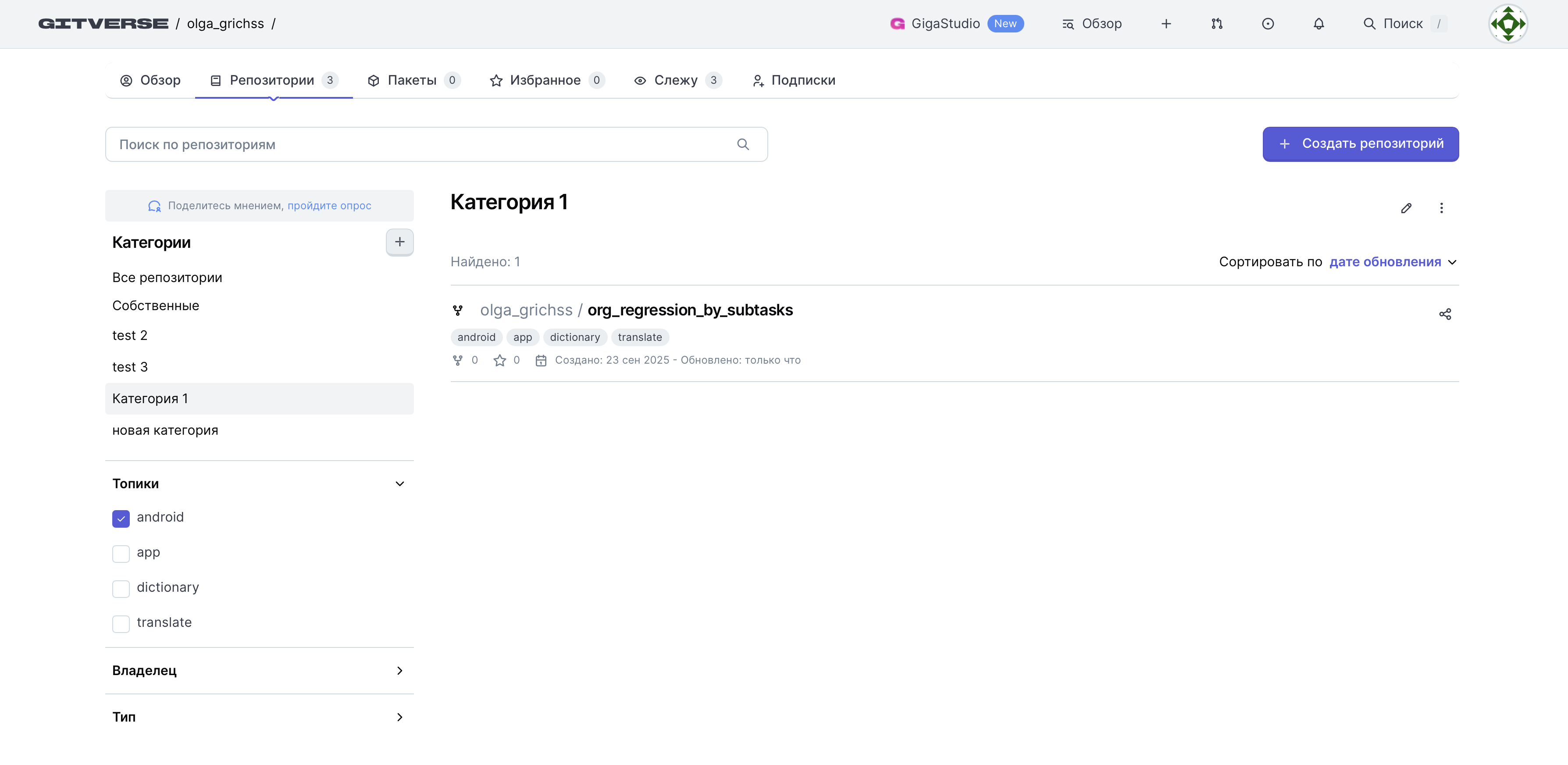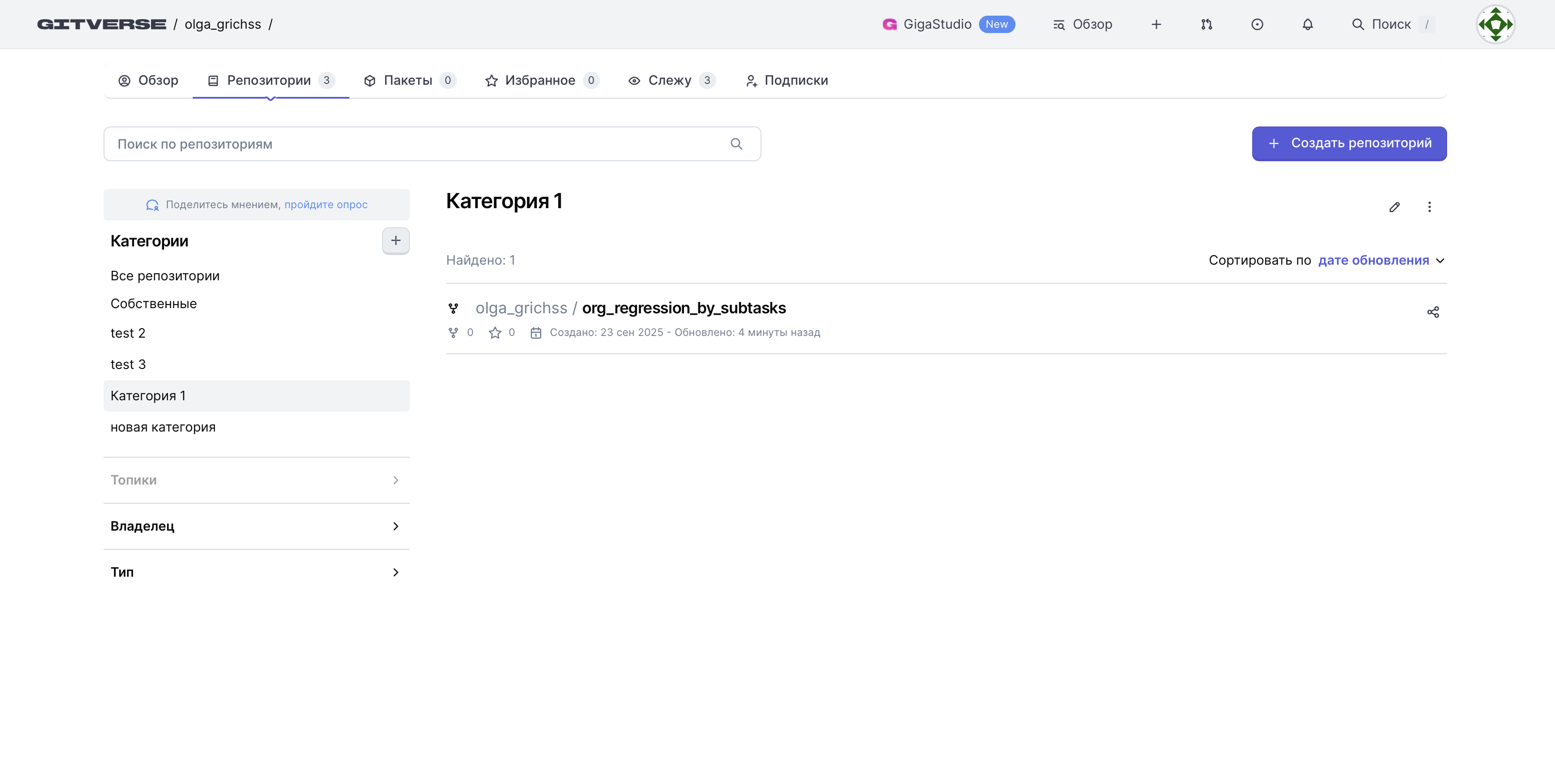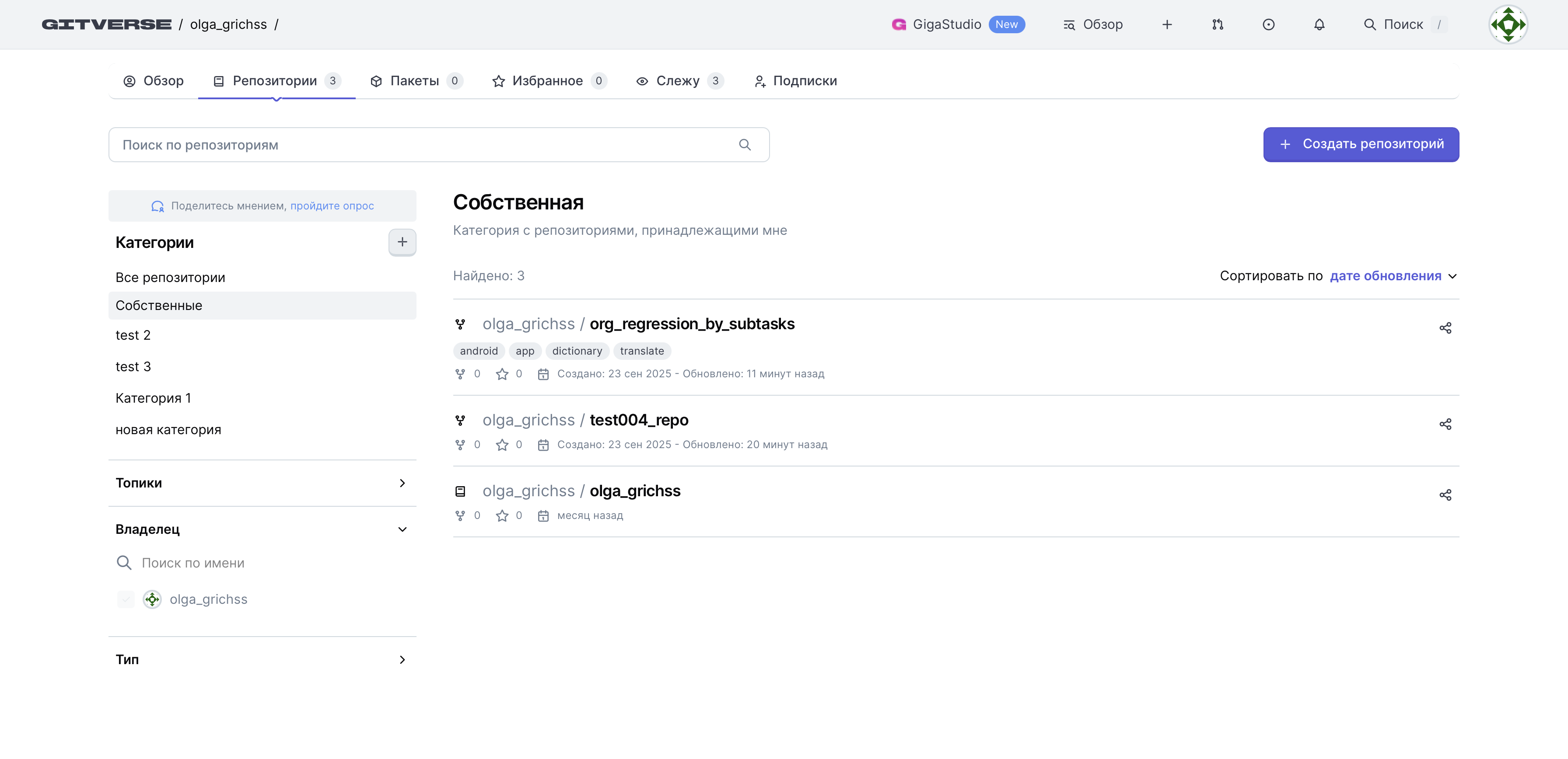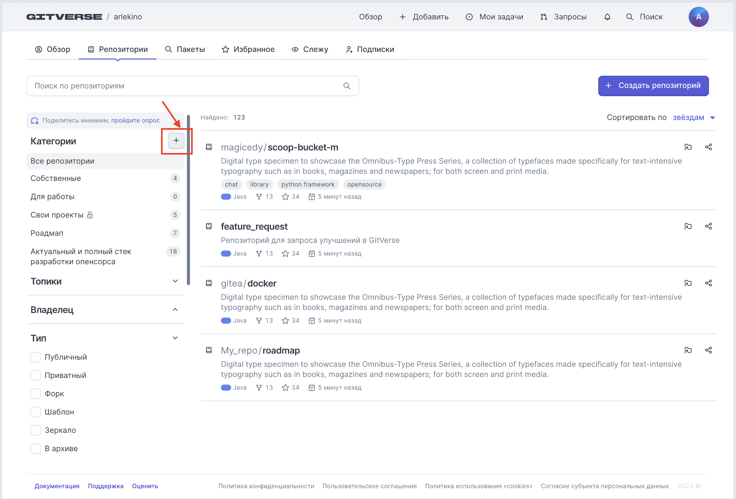 Для быстрого поиска нужного репозитория на вкладке Репозитории доступны фильтры: топики, владелец, тип.