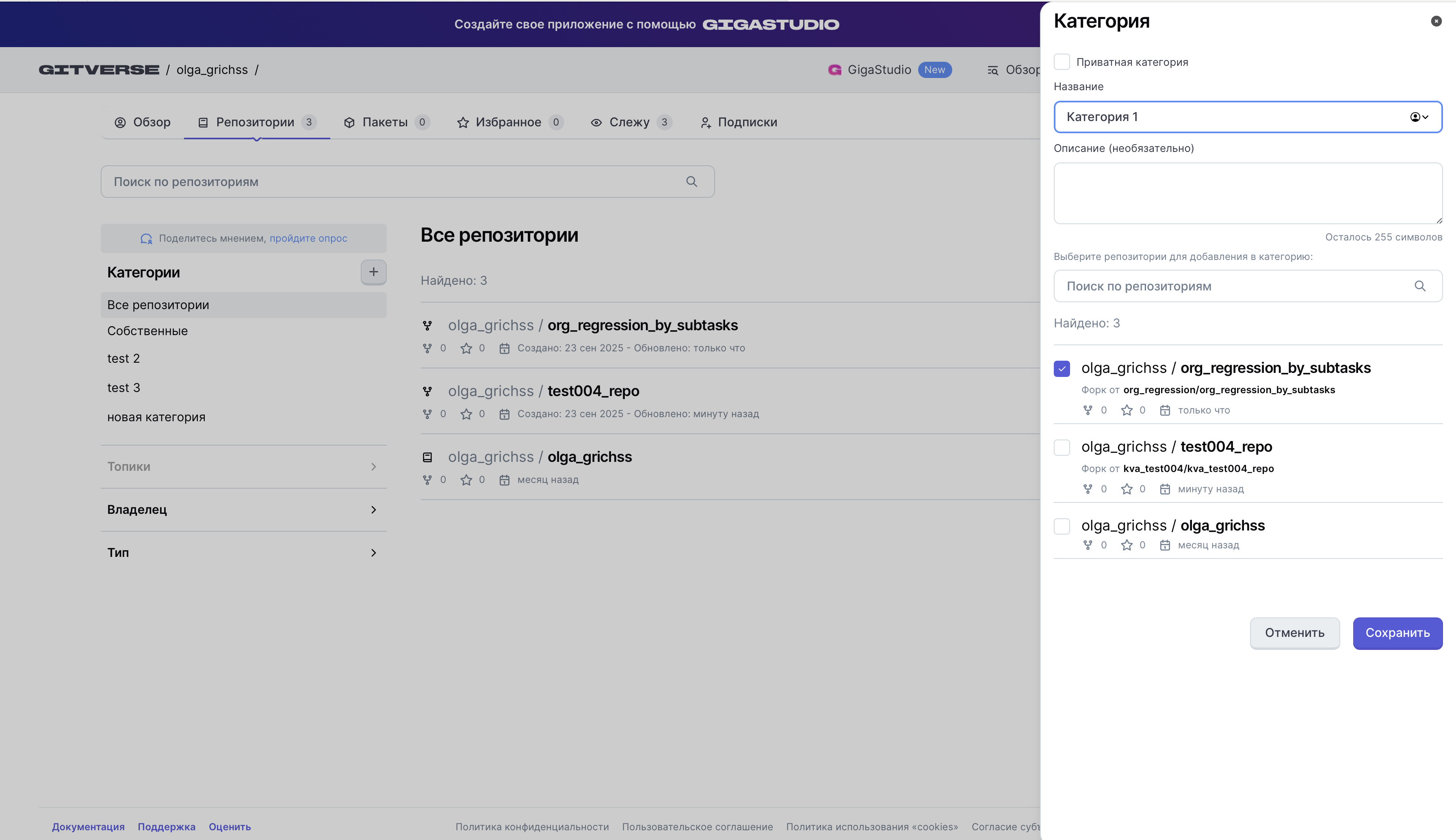 Откроется шторка добавления/редактирования категории. Укажите видимость (приватная/публичная), название, описание и добавьте репозитории. Нажмите Сохранить: