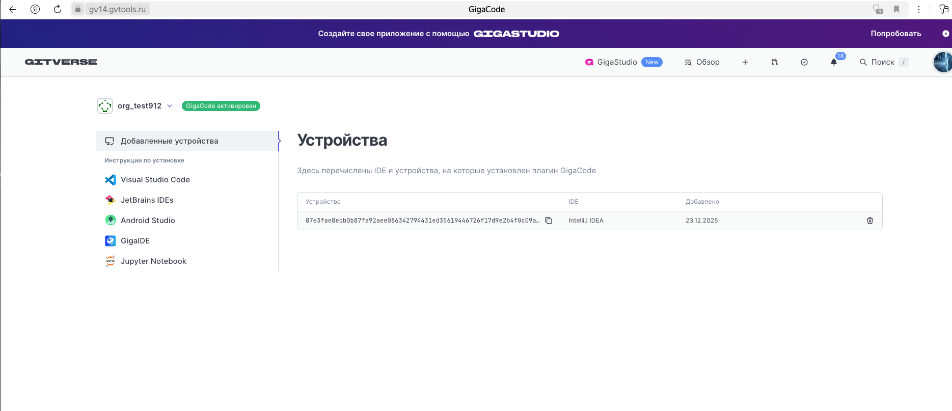- Перейдите в профиль организации > Настройки > GigaCode.