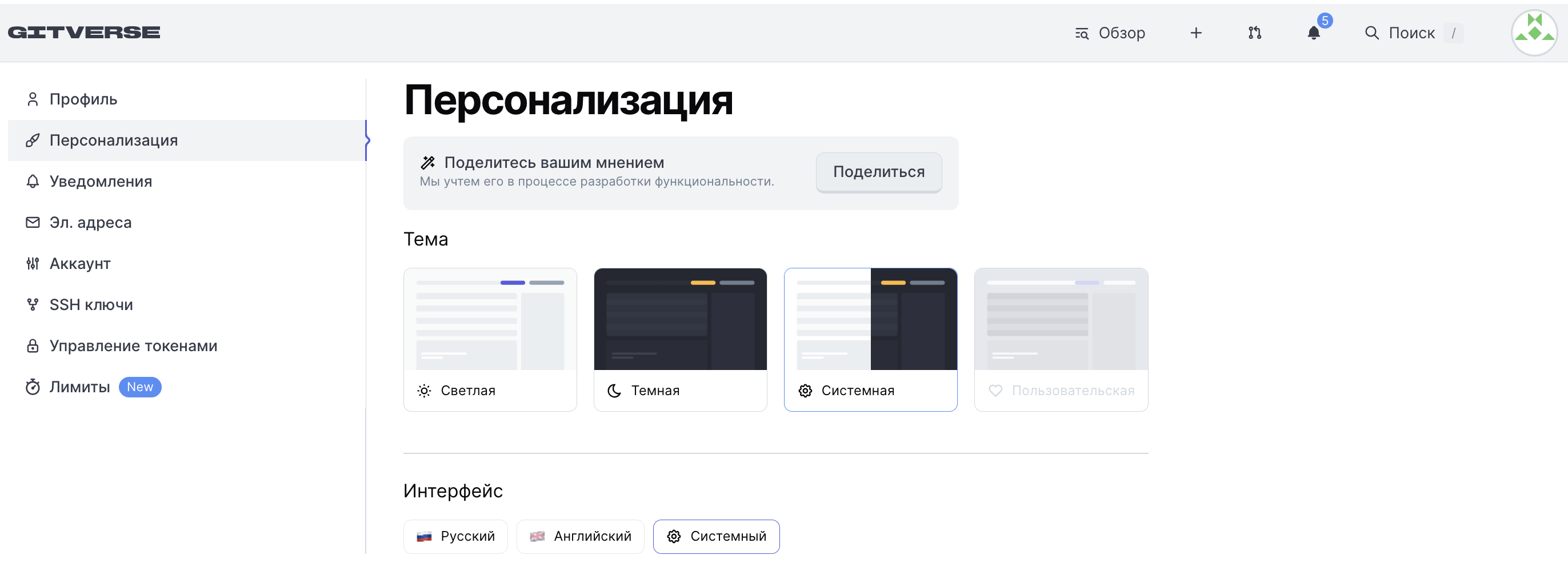 ΠΡ ΠΌΠΎΠΆΠ΅ΡΠ΅ Π½Π°ΡΡΡΠ°ΠΈΠ²Π°ΡΡ ΠΈΠ½ΡΠ΅ΡΡΠ΅ΠΉΡ GitVerse Π΄Π»Ρ Π±ΠΎΠ»Π΅Π΅ ΡΠ΄ΠΎΠ±Π½ΠΎΠΉ ΡΠ°Π±ΠΎΡΡ. ΠΠ»Ρ ΡΡΠΎΠ³ΠΎ Π½Π°ΠΆΠΌΠΈΡΠ΅ Π½Π° Π°Π²Π°ΡΠ°Ρ Π² ΡΠ°ΠΏΠΊΠ΅ ΡΡΡΠ°Π½ΠΈΡΡ -> ΠΠ°ΡΡΡΠΎΠΉΠΊΠΈ. ΠΡΠΊΡΠΎΠ΅ΡΡΡ ΡΡΡΠ°Π½ΠΈΡΠ° ΠΏΠ΅ΡΡΠΎΠ½Π°Π»ΠΈΠ·Π°ΡΠΈΠΈ: