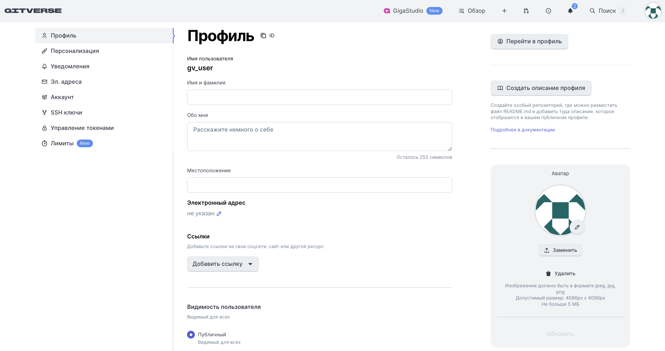ΠΡ ΠΌΠΎΠΆΠ΅ΡΠ΅ ΠΏΠΎΠ΄Π΅Π»ΠΈΡΡΡΡ Π΄ΠΎΠΏΠΎΠ»Π½ΠΈΡΠ΅Π»ΡΠ½ΠΎΠΉ ΠΈΠ½ΡΠΎΡΠΌΠ°ΡΠΈΠ΅ΠΉ ΠΎ ΡΠ΅Π±Π΅ Ρ ΡΠΎΠΎΠ±ΡΠ΅ΡΡΠ²ΠΎΠΌ GitVerse. ΠΠ»Ρ ΡΡΠΎΠ³ΠΎ ΠΏΠ΅ΡΠ΅ΠΉΠ΄ΠΈΡΠ΅ Π² Π½Π°ΡΡΡΠΎΠΉΠΊΠΈ, Π½Π°ΠΆΠ°Π² Π½Π° ΡΠ²ΠΎΠΉ Π°Π²Π°ΡΠ°Ρ Π² ΡΠ°ΠΏΠΊΠ΅ ΡΡΡΠ°Π½ΠΈΡΡ -> ΠΠ°ΡΡΡΠΎΠΉΠΊΠΈ -> ΠΡΠΎΡΠΈΠ»Ρ: