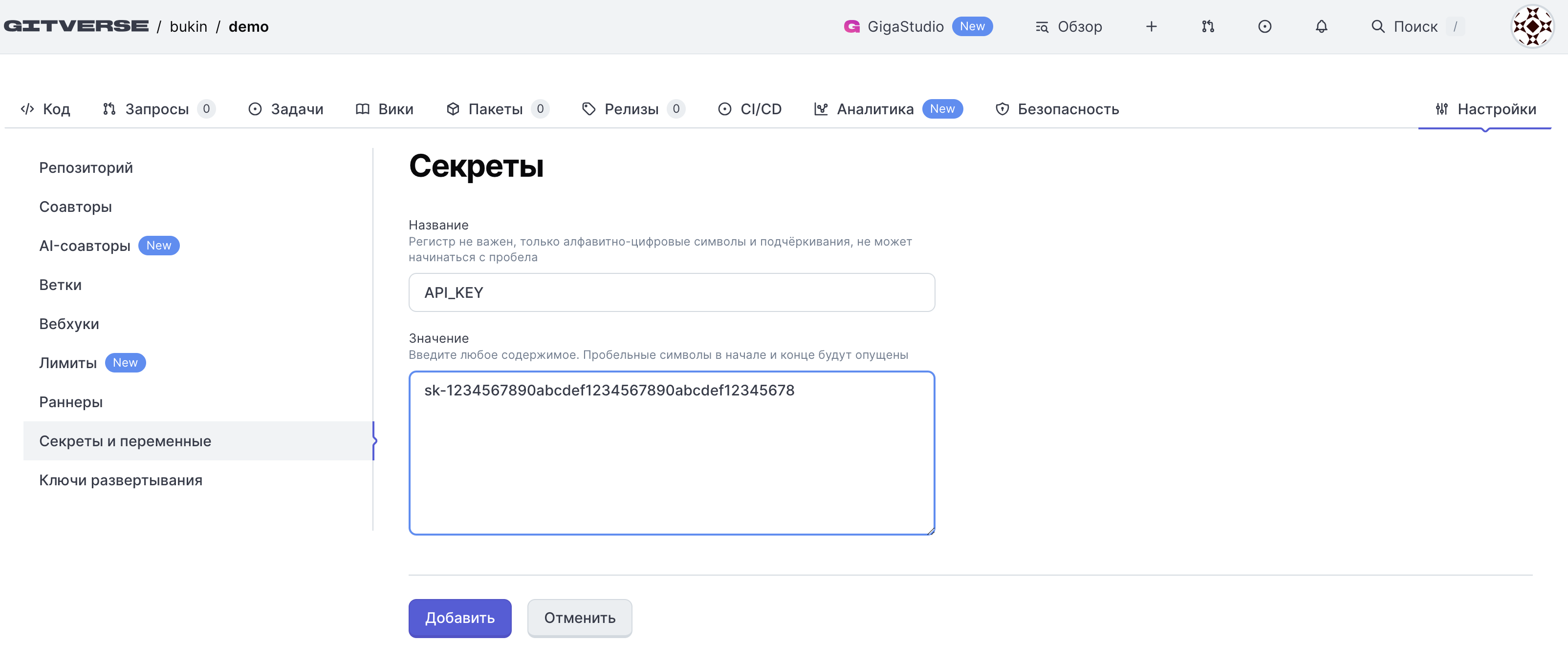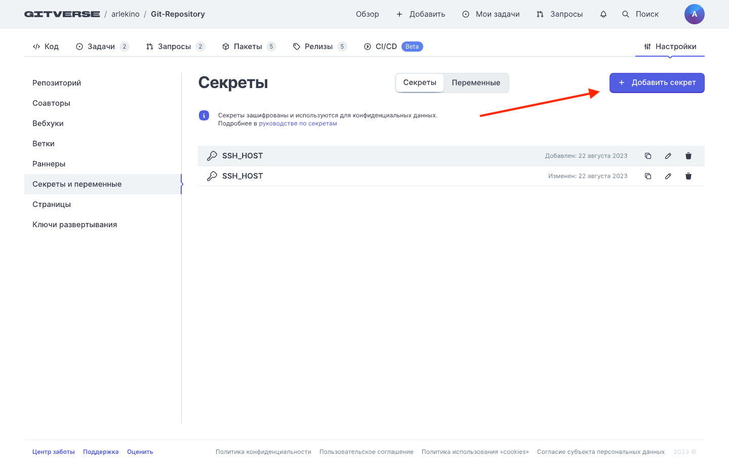 - cекреты шифруются при хранении и передаче между GitVerse и раннером;