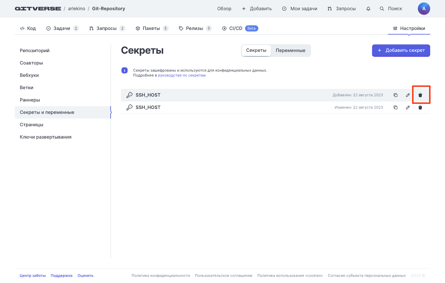 Для удаления секрета нажмите кнопку удаления у соответствующего секрета: