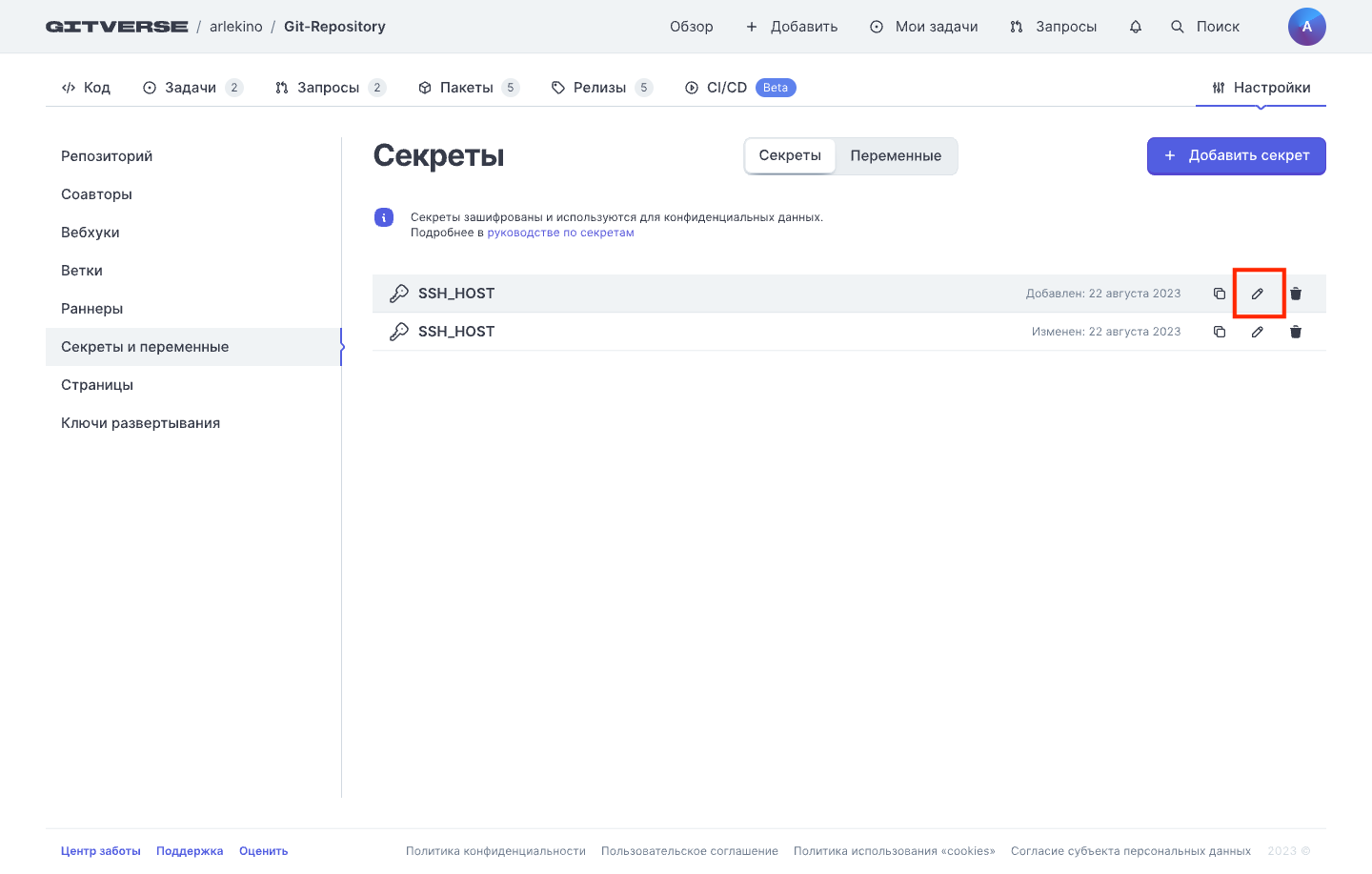 Для редактирования секрета нажмите кнопку редактирования у соответствующего секрета: