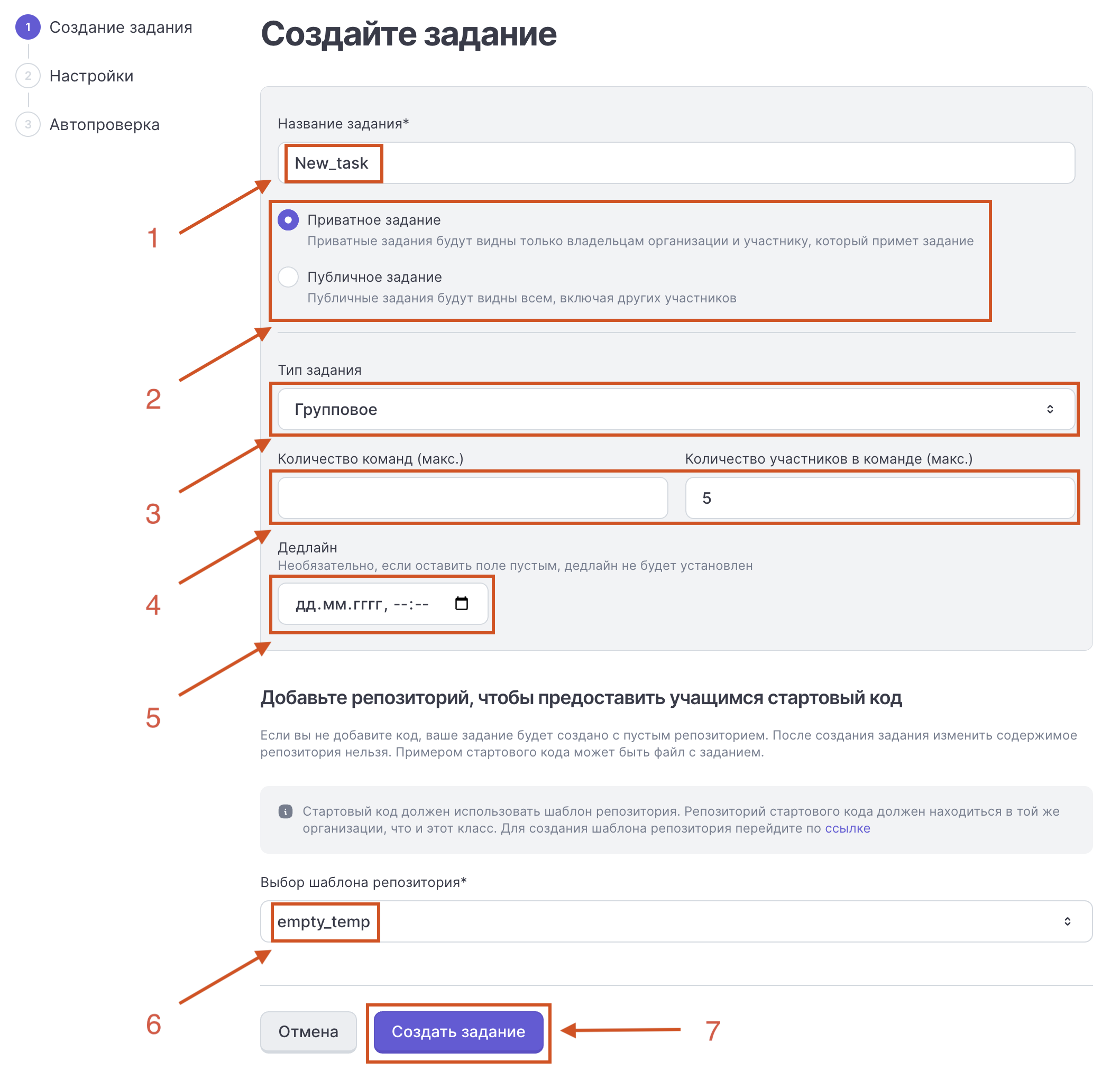 - Создание задания, 1-й этап. На этапе создания задания вы выбираете шаблон репозитория, определяете название, дедлайн и др.