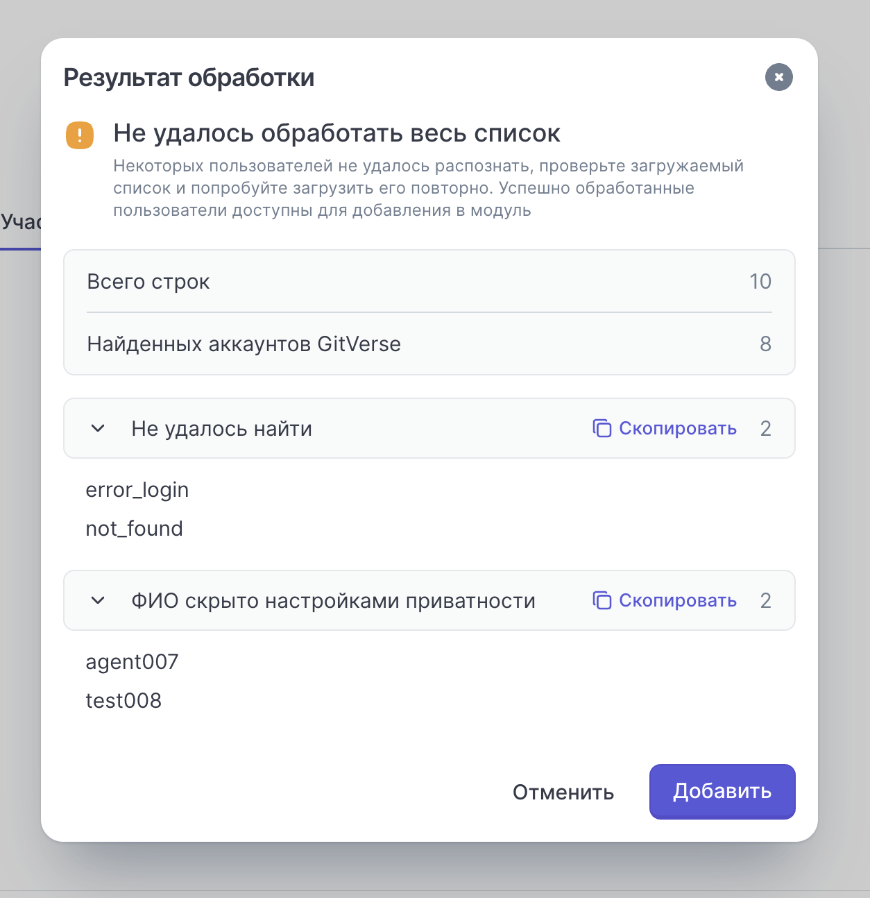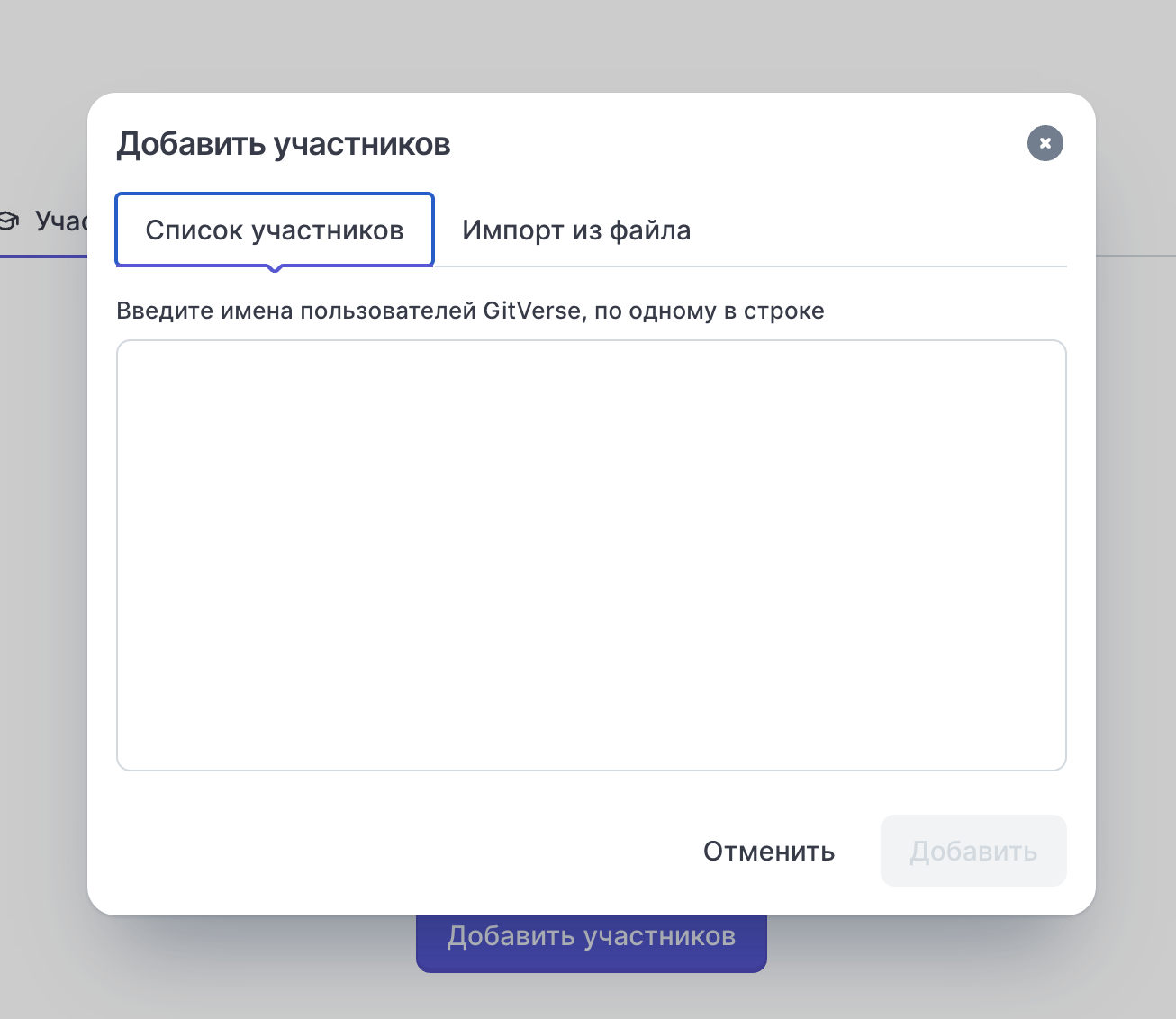 Вы можете ввести список имен пользователей GitVerse в текстовое поле (каждое имя с новой строки) или загрузить готовый файл.