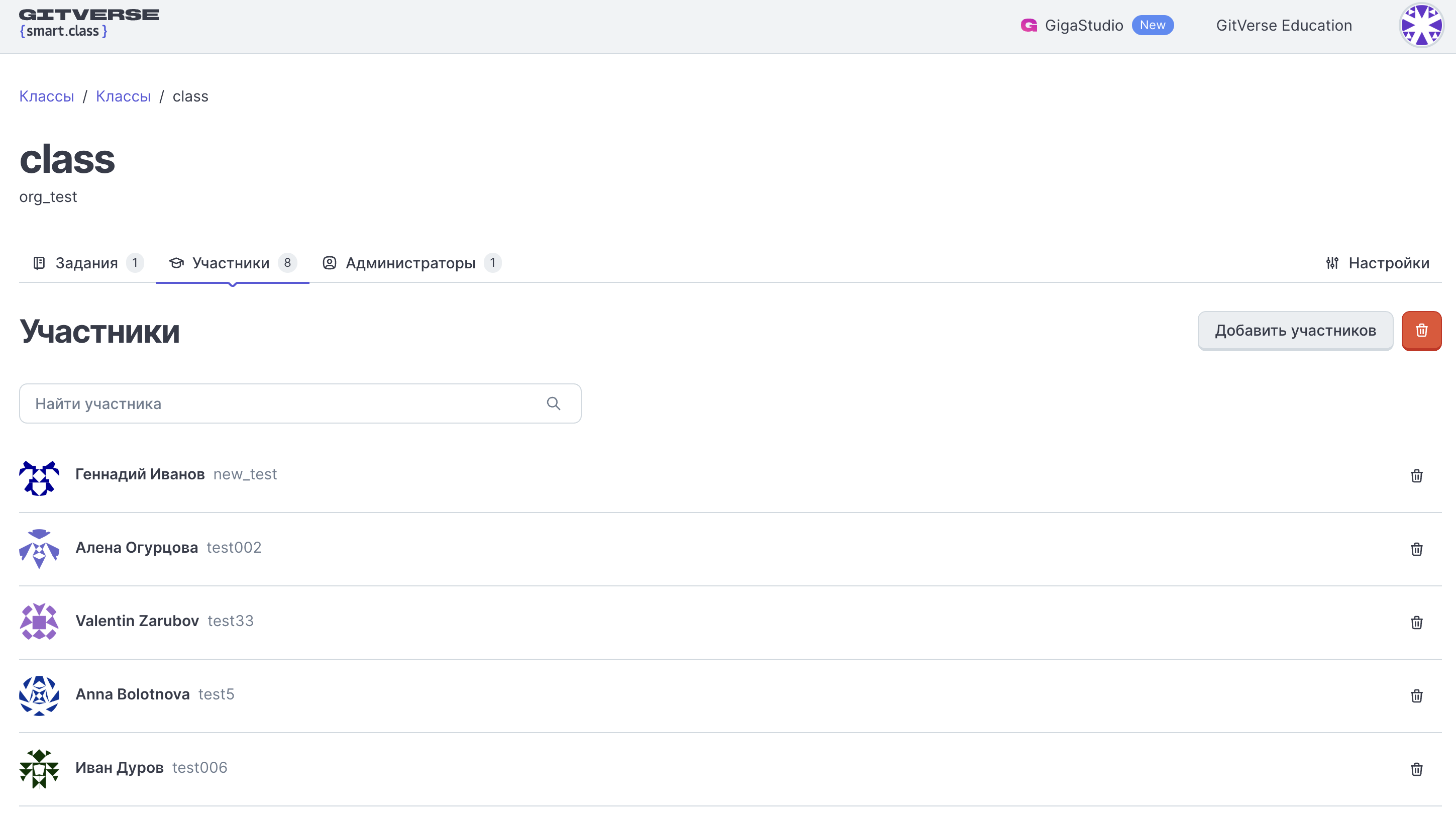 - Пиктограмма удаления -> удаляет задание, студентов и их учебные репозитории.