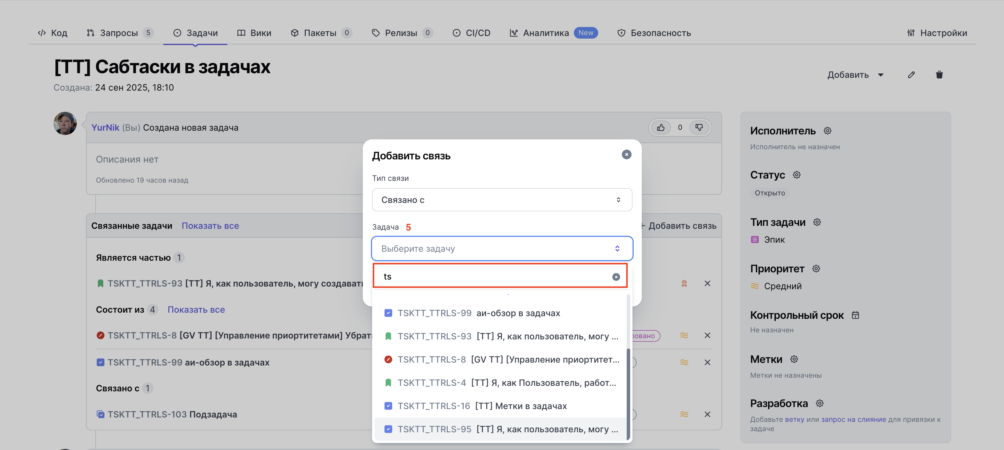 В GitVerse вы можете устанавливать связи между задачами и создавать подзадачи — это помогает структурировать работу, отслеживать зависимости и видеть полную картину проекта.